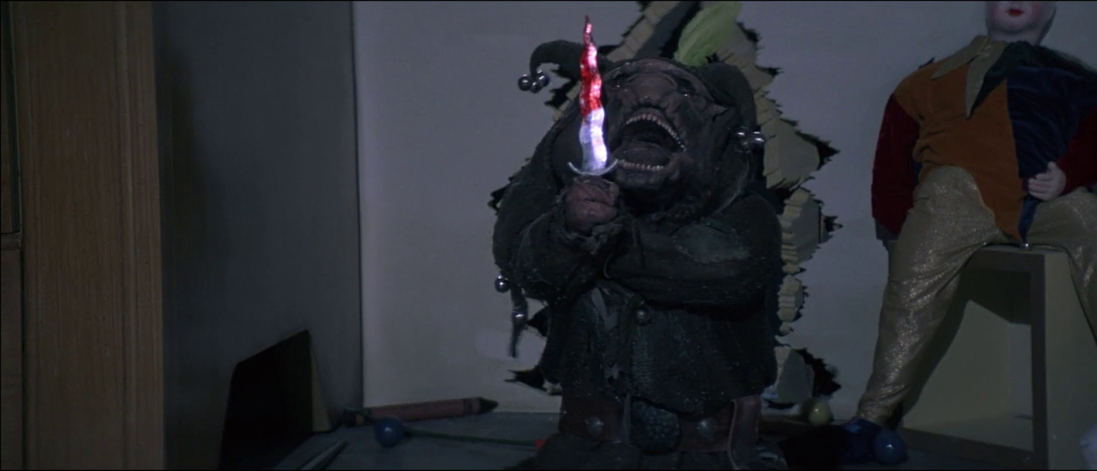 And that little breath-sucking troll is hideous, with his glowing red eyes and pointy teeth, wearing his raggedy little outfit with bells hanging off of it and a tiny knife in hand. As an adult, I can see that this creature is largely played for laughs, and of course it is - the idea of this thing is absurd. But it wasn't absurd or funny to me as a kid. This troll was one of the most horrifying things I had ever seen, and I was convinced that one of these trolls actually lived in the walls of my house. For years I lived in fear of disturbing the troll in my walls. I made sure not to bump the walls because I thought that would draw the troll out. Of all the things I witnessed in horror movies at ages when other kids I knew weren't allowed to watch horror movies, this troll is one of the things that disturbed me the most. My only solace was that we always had cats in the house.